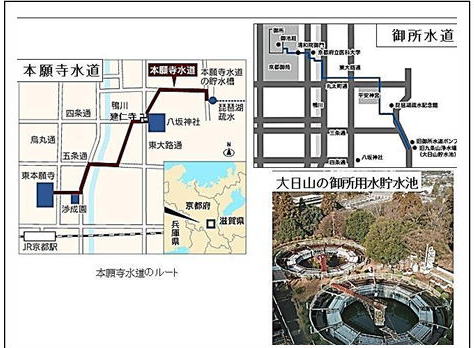 • 京都御所は標高が東本願寺より約 20m高く水圧が不足するので、蹴上船 溜まりからポンプで 30m 高い大日山 に設けた貯水池に水を汲み揚げて