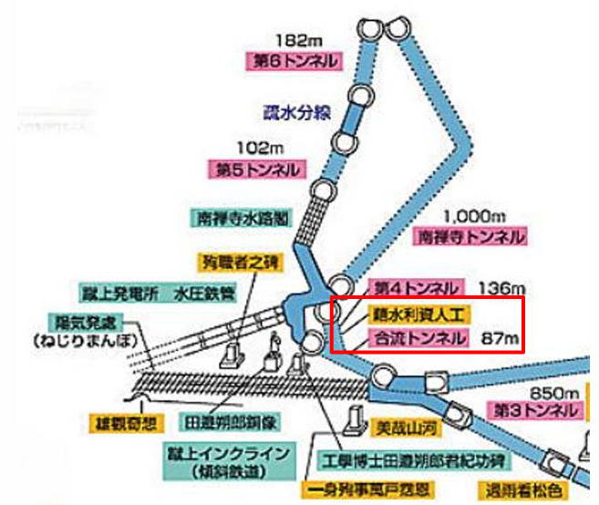 疏水工事の起工が 1 年半遅れた事で、朔郎と高木文平はアメリカに出張し水力発電に 巡り合えたこと。