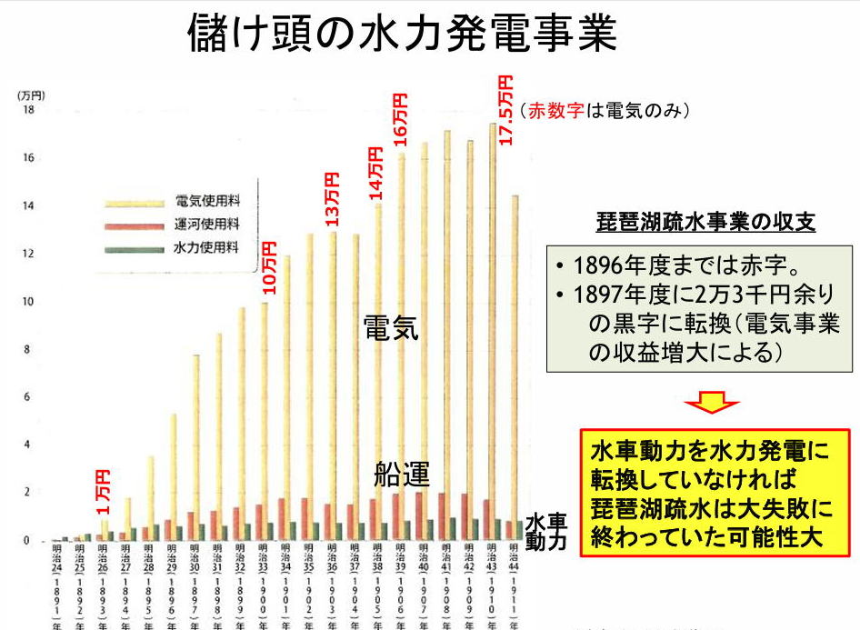 渡米当時、米国では運河による舟運はピークを過ぎ、鉄道輸送に取って代わられつつあ った。日本でも早晩同じ運命を迎えるであろうことを二人は明確に悟り、“電気の時代” 到来を確信する。 ⇒ 舟運だけでは琵琶湖疏水は失敗するという危機感。